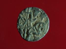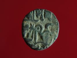 | Description / विवरण | This is a copper coin with silver coating. The depression on obverse side depicts deity sitting on a horse and holding a trident in his right hand. On reverse side a bull in a standing position. Shape is almost circular. Surface is smooth. Appearance is metallic bronze. |