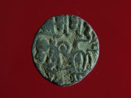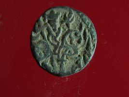 | Description / विवरण | This is a copper coin with silver coating. The depression on obverse side depicts deity sitting on a horse and holding a trident in his right hand. On reverse side a bull in a standing position. Shape is almost circular. Surface is smooth. Appearance is metallic bronze. |
