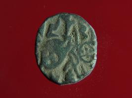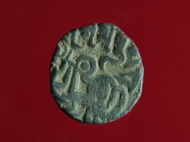 | Description / विवरण | This is a copper coin. The depression on obverse side depicts deity sitting on a horse and holding a spear in his right hand. On reverse side a bull in a sitting position. Shape is almost circular. Surface is smooth. Appearance is metallic bronze. |