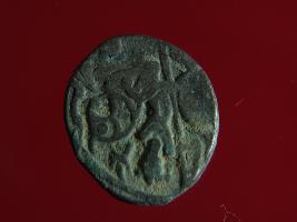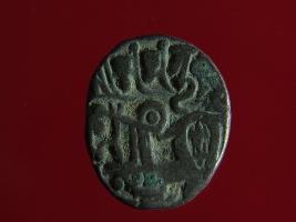 | Description / विवरण | This is a copper coin. The depression on obverse side depicts deity sitting on a horse and holding a spear in his right hand. On reverse side a bull in a sitting position. Shape is almost circular. Surface is smooth. Appearance is metallic bronze. |