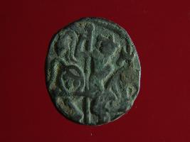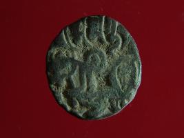 | Description / विवरण | This is a copper coin. The depression on obverse side depicts deity sitting on a horse and holding a spear in his right hand. On reverse side a bull in a sitting position. Shape is almost circular. Surface is smooth. Appearance is metallic bronze. |