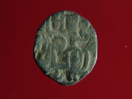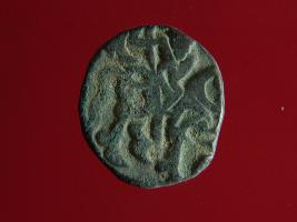 | Description / विवरण | This is a copper coin. The depression on obverse side depicts deity sitting on a horse and holding a spear in his right hand. On reverse side a bull in a sitting position. Shape is almost circular. Surface is smooth. Appearance is metallic bronze. |