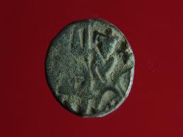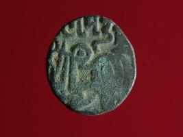 | Description / विवरण | This is a copper coin. The depression on obverse side depicts deity sitting on a horse and holding a spear in his right hand. On reverse side a bull in a sitting position. Shape is almost circular. Surface is smooth. Appearance is metallic bronze. |