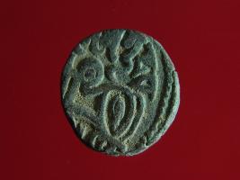 | Description / विवरण | This is a copper coin. The depression on obverse side depicts deity sitting on a horse and holding a spear in his right hand. On reverse side a bull in a sitting position. Shape is almost circular. Surface is smooth. Appearance is metallic bronze. |