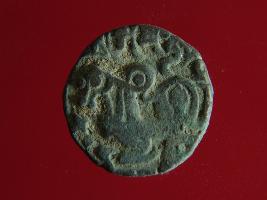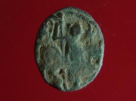 | Description / विवरण | This is a copper coin. The depression on obverse side depicts deity sitting on a horse and holding a spear in his right hand. On reverse side a bull in a sitting position. Shape is almost circular. Surface is smooth. Appearance is metallic bronze. |