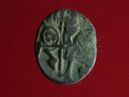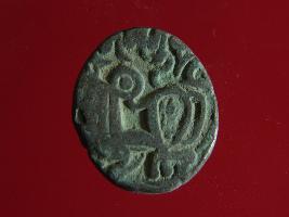 | Description / विवरण | This is a copper coin. The depression on obverse side depicts deity sitting on a horse and holding a spear in his right hand. On reverse side a bull in a sitting position. Shape is almost circular. Surface is smooth. Appearance is metallic bronze. |