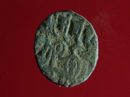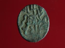 | Description / विवरण | This is a copper coin. The depression on obverse side depicts deity sitting on a horse and holding a spear in his right hand. On reverse side a bull in a sitting position. Shape is almost circular. Surface is smooth. Appearance is metallic bronze. |