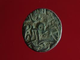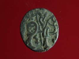 | Description / विवरण | This is a copper coin. The depression on obverse side depicts deity sitting on a horse and holding a spear in his right hand. On reverse side a bull in a sitting position. Shape is almost circular. Surface is smooth. Appearance is metallic bronze. |