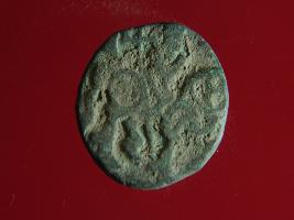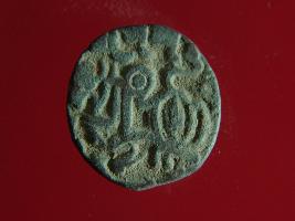 | Description / विवरण | This is a copper coin. The depression on obverse side depicts deity sitting on a horse and holding a spear in his right hand. On reverse side a bull in a sitting position. Shape is almost circular. Surface is smooth. Appearance is metallic bronze. |