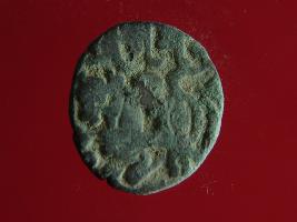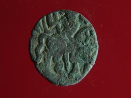 | Description / विवरण | This is a copper coin. The depression on obverse side depicts deity sitting on a horse and holding a spear in his right hand. On reverse side a bull in a sitting position. Shape is almost circular. Surface is smooth. Appearance is metallic bronze. |