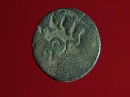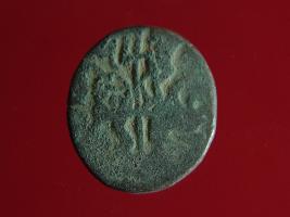 | Description / विवरण | This is a copper coin. The depression on obverse side depicts deity sitting on a horse and holding a spear in his right hand. On reverse side a bull in a sitting position. Shape is almost circular. Surface is smooth. Appearance is metallic bronze. |