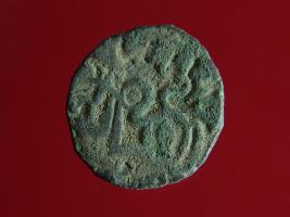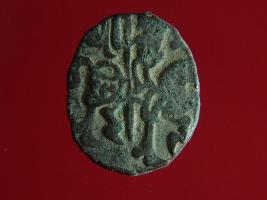 | Description / विवरण | This is a copper coin. The depression on obverse side depicts deity sitting on a horse and holding a spear in his right hand. On reverse side a bull in a sitting position. Shape is almost circular. Surface is smooth. Appearance is metallic bronze. |