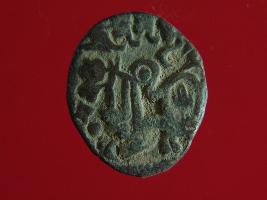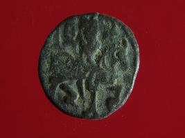 | Description / विवरण | This is a copper coin. The depression on obverse side depicts deity sitting on a horse and holding a spear in his right hand. On reverse side a bull in a sitting position. Shape is almost circular. Surface is smooth. Appearance is metallic bronze. |