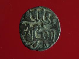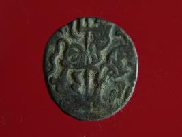 | Description / विवरण | This is a copper coin. The depression on obverse side depicts deity sitting on a horse and holding a spear in his right hand. On reverse side a bull in a sitting position. Shape is almost circular. Surface is smooth. Appearance is metallic bronze. |