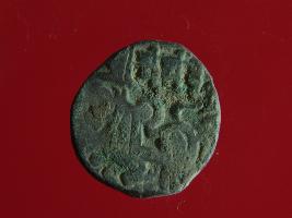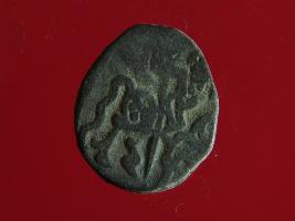 | Description / विवरण | This is a copper coin. The depression on obverse side depicts deity sitting on a horse and holding a spear in his right hand. On reverse side bull in a sitting position. Shape is almost circular. Surface is smooth. Appearance is metallic bronze. |