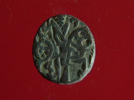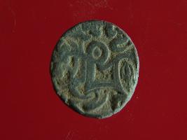 | Description / विवरण | This is a copper coin. The depression on obverse side depicts deity sitting on a horse and holding a spear in his right hand. On reverse side a bull in a sitting position. Surface is smooth. Appearance is metallic bronze. |