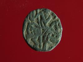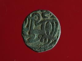 | Description / विवरण | This is a copper coin. The depression on obverse side depicts deity sitting on a horse and holding a spear in his right hand. On reverse side bull in a sitting position. Shape is almost circular. Surface is smooth. Appearance is metallic bronze. |