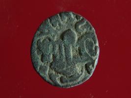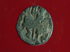 | Description / विवरण | This is a copper coin. The depression on obverse side depicts deity sitting on a horse and holding a spear in his right hand. On reverse side bull in sitting position. Shape is almost circular. Surface is smooth. Appearance is metallic bronze. |