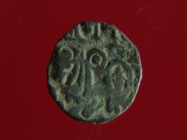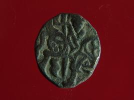 | Description / विवरण | This is a copper coin. The depression on obverse side depicts deity sitting on a horse and holding a spear in his right hand. On reverse side bull in a sitting position. Shape is almost circular. Surface is smooth. Appearance is metallic bronze. |