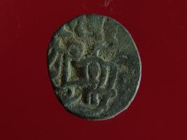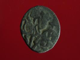 | Description / विवरण | This is a copper coin. The depression on obverse side depicts deity sitting on a horse and holding a spear in his right hand. On reverse side bull in a sitting position. Shape is almost circular. Surface is smooth. Appearance is metallic bronze. |