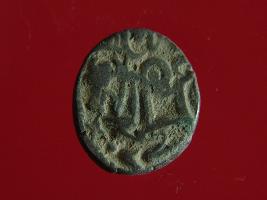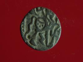 | Description / विवरण | This is a copper coin. The depression on obverse side depicts deity sitting on a horse and holding a spear in his right hand. On reverse side bull in a sitting position. Shape is almost circular. Surface is smooth. Appearance is metallic bronze. |