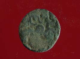 | Description / विवरण | This is a copper coin. The depression on obverse side depicts deity sitting on a horse and holding a spear in his right hand. On reverse side bull in a sitting position. Shape is almost circular. Surface is smooth. Appearance is metallic bronze. |