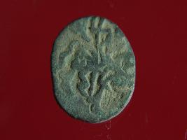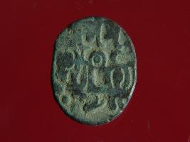 | Description / विवरण | This is a copper coin. The depression on obverse side depicts deity sitting on a horse and holding a spear in his right hand. On reverse side bull in a sitting position. Shape is almost circular. Surface is smooth. Appearance is metallic bronze. |