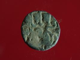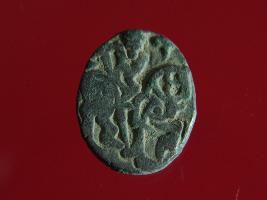 | Description / विवरण | This is a copper coin. The depression on obverse side depicts deity sitting on a horse and holding a spear in his right hand. On reverse side bull in a sitting position. Shape is almost circular. Surface is smooth. Appearance is metallic bronze. |
