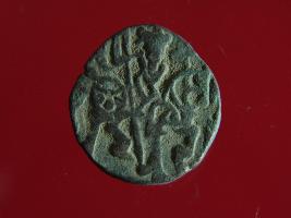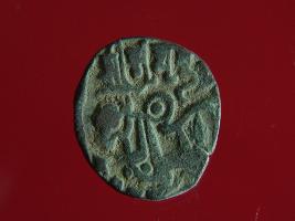 | Description / विवरण | This is a copper coin. The depression on obverse side depicts deity sitting on a horse and holding a spear in his right hand. On reverse side bull in a sitting position. Shape is almost circular. Surface is smooth. Appearance is metallic bronze. |