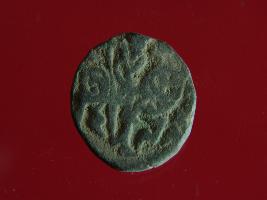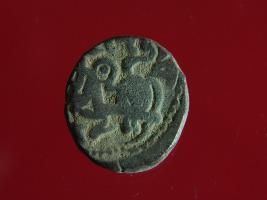 | Description / विवरण | This is a copper coin. The depression on obverse side depicts deity sitting on a horse and holding a spear in his right hand. On reverse side bull in a sitting position. Shape is almost circular. Surface is smooth. Appearance is metallic bronze. |