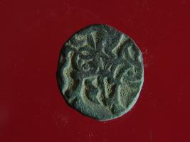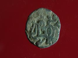 | Description / विवरण | This is a copper coin. The depression on obverse side depicts deity sitting on a horse and holding a spear in his right hand. On reverse side bull in a sitting position. Shape is almost circular. Surface is smooth. Appearance is metallic bronze. |