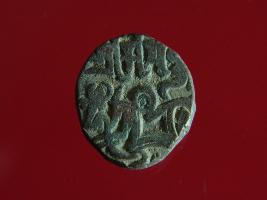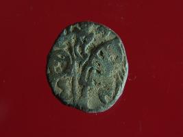 | Description / विवरण | This is a copper coin. The depression on obverse side depicts deity sitting on a horse and holding a spear in his right hand. On reverse side bull in a sitting position. Shape is almost circular. Surface is smooth. Appearance is metallic bronze. |