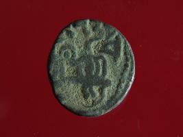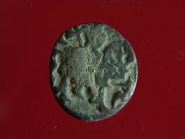 | Description / विवरण | This is a copper coin. The depression on obverse side depicts deity sitting on a horse and holding a spear in his right hand. On reverse side bull in a sitting position. Shape is almost circular. Surface is smooth. Appearance is metallic bronze. |