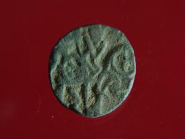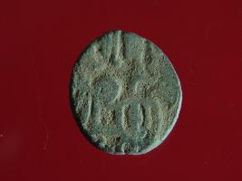 | Description / विवरण | This is a copper coin. The depression on obverse side depicts deity sitting on a horse and holding a spear in his right hand. On reverse side bull in a sitting position. Shape is almost circular. Surface is smooth. Appearance is metallic bronze. |