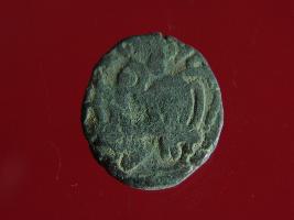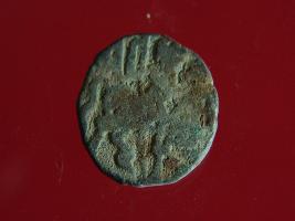 | Description / विवरण | This is a copper coin. The depression on obverse side depicts deity sitting on a horse and holding a spear in his right hand. On reverse side bull in a sitting position. Shape is almost circular. Surface is smooth. Appearance is metallic bronze. |