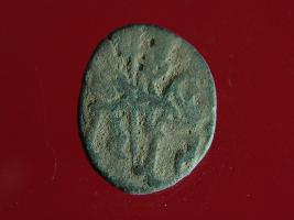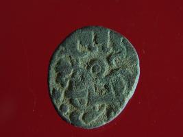 | Description / विवरण | This is a copper coin. The depression on obverse side depicts deity sitting on a horse and holding a spear in his right hand. On reverse side bull in a sitting position. Shape is almost circular. Surface is smooth. Appearance is metallic bronze. |