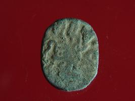 | Description / विवरण | This is a copper coin. The depression on obverse side depicts deity sitting on a horse and holding a spear in his right hand. On reverse side bull in a sitting position. Shape is almost circular. Surface is smooth. Appearance is metallic bronze. |