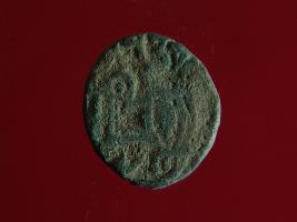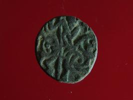 | Description / विवरण | This is a copper coin. The depression on obverse side depicts deity sitting on a horse and holding a spear in his right hand. On reverse side bull in a sitting position. Shape is almost circular. Surface is smooth. Appearance is metallic bronze. |