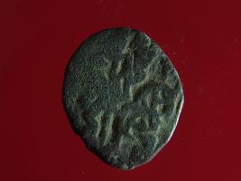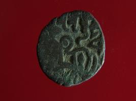 | Description / विवरण | This is a copper coin. The depression on obverse side depicts deity sitting on a horse and holding a spear in his right hand. On reverse side bull in a sitting position. Shape is almost circular. Surface is smooth. Appearance is metallic bronze. |