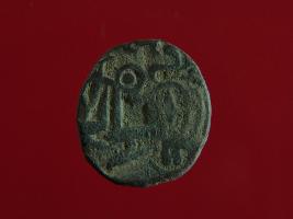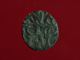 | Description / विवरण | This is a copper coin. The depression on obverse side depicts deity sitting on a horse and holding a spear in his right hand. On reverse side bull in a sitting position. Shape is almost circular. Surface is smooth. Appearance is metallic bronze. |