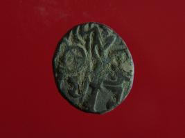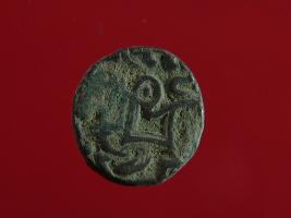 | Description / विवरण | This is a copper coin. The depression on obverse side depicts deity sitting on a horse and holding a spear in his right hand. On reverse side bull in a sitting position. Shape is almost circular. Surface is smooth. Appearance is metallic bronze. |