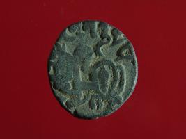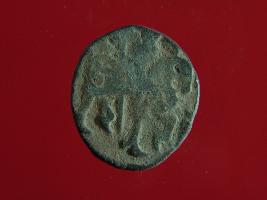 | Description / विवरण | This is a copper coin. The depression on obverse side depicts deity sitting on a horse and holding a spear in his right hand. On reverse side bull in a sitting position. Shape is almost circular. Surface is smooth. Appearance is metallic bronze. |