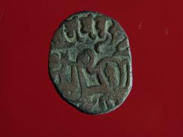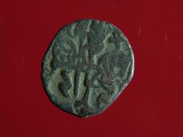 | Description / विवरण | This is a copper coin. The depression on obverse side depicts a deity sitting on a horse and holding a spear in his right hand and on reverse side a bull in a sitting position and some inscription mark written above them. Shape is circular. Surface is smooth. Appearance is metallic bronze. Hard patina deposited on it. |