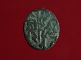 | Description / विवरण | It is a coin made of copper. The depression on obverse side depicts a deity sitting on a horse and holding a spear in his right hand. On reverse side bull in a sitting position. Shape is circular. Surface is smooth. Appearance is metallic bronze. |
