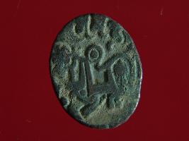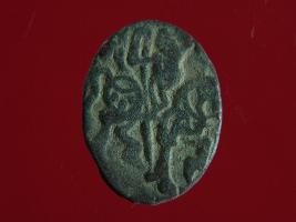 | Description / विवरण | It is a coin made of copper. The depression on obverse side depicts a deity sitting on a horse and holding a spear in his right hand. On reverse side bull in a sitting position. Shape is circular. Surface is smooth. Appearance is metallic bronze. |