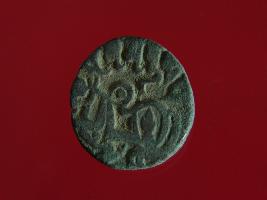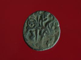 | Description / विवरण | It is a coin made of copper. The depression on obverse side depicts a deity sitting on a horse and holding a spear in his right hand. On reverse side bull in a sitting position. Shape is circular. Surface is smooth. Appearance is metallic bronze. |
