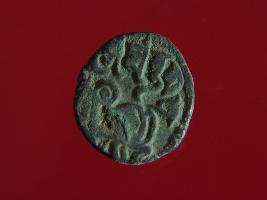 | Description / विवरण | It is a coin made of copper. The depression on obverse side depicts a deity sitting on a horse and holding a spear in his right hand. On reverse side bull in a sitting position. Shape is circular. Surface is smooth. Appearance is metallic bronze. |