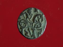 | Description / विवरण | It is a coin made of copper. The depression on obverse side depicts a deity sitting on a horse and holding a spear in his right hand. On reverse side bull in a sitting position. Shape is circular. Surface is smooth. Appearance is metallic bronze. |