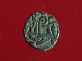 | Description / विवरण | It is a coin made of copper. The depression on obverse side depicts a deity sitting on a horse and holding a spear in his right hand. On reverse side bull in a sitting position. Shape is circular. Surface is smooth. Appearance is metallic bronze. |
