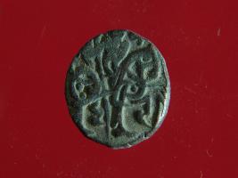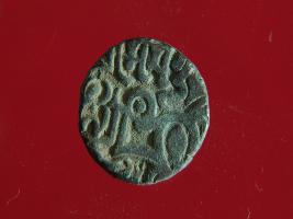 | Description / विवरण | It is a coin made of copper. The depression on obverse side depicts a deity sitting on a horse and holding a spear in his right hand. On reverse side bull in a sitting position. Shape is circular. Surface is smooth. Appearance is metallic bronze. |